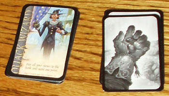 The Game DesignOverall, Fist of Dragonstones plays well, without problems. Some of the best game design points include: Randomness Carefully Controlled: There really isn't a lot of randomness in this game. Sure, which special characters will appear is random, as is the order that the 9 auctions after the witch ... but the player is given a large amount of control over that because he knows what characters are available, and what their powers are, and thus gets to make his own decisions about how to bid for them. The only other bit of randomness comes from the dragonstones, which are randomly picked at various points in the game. However, this too is offset, because players can gain VPs from dragonstones in three ways: a matching set of 4, a matching set of 1 each, or any 4 stones. In addition, the dragons allow players to capture the specific stone color that they might be looking for. Multiple Paths to Victory: Closely related to this is the fact that there are multiple paths to victory, which generally increases the strategic gameplay in a game. As already noted, there are a number of ways to achieve VPs. In addition you could work for strategies where you collect more gold or even more silver, as a way to bootstrap yourself up to victory. Good Trading Valuations: In my opinion any good trading (or in this case auction) game requires the same resources to have remarkably different valuations to different players. The aforementioned multiple paths to victory insure this in Dragonstones. Sometimes you might be totally uncontested for a character card that only you see the value in, and at other times you might be in for a fierce battle. Good Balance of Characters: Dragonstones has lots of different characters with lots of different powers, and that offers the opportunity for unbalance. However, by putting those all up for auction, balance quickly reasserts itself. The more valuable characters get bid up more. Dragonstones also offers the opportunity for some more wacky characters to really disrupt the game, but balances that out by making them "special" characters who'll never show up more than once a game; nice. Good End Game : The end game is designed quite well because it doesn't have the "rollback" problem that many games have, where a game continues forever because the winner keeps getting knocked down. Despite that, there's still ways to keep a lead player from going out, by bidding for the characters that he wants or by casting black magic upon his winning bids. Nonetheless, when a player advances to a sufficiently mature end game stage he will be able to win, because he'll have multiple paths to victory, as already discussed, and they can't all be blocked. My complaints about Dragonstones' game design are pretty minor ones: Game is Overly Abstract: There's a story, "The Legend of Dragonstones", which is intended to give a background for this game, but it still comes across feeling too abstract. Who are you playing, exactly? Why do you have fairie gold that returns every night? Why do these characters do your bidding? Adding extra specificity to the backstory might have done the trick here, but the lack of any physical locality in the game also contributed to the feeling of abstraction. Granularity for VPs Low: The granularity for VPs, which only went from 0 to 3, felt low. Someone could jump from nothing to about to win (ie, 2 points) with one move. This feeling might go away with extra play, as the ability to grab victory points is usually presaged by the collection of dragonstones, but nonethless it made things feel a bit more random in the game we played. Secret Auctioning Hard: Keeping your bid secret is a bit tricky, because other players can discern whether you're picking up coins or not even if they're trying not to. We solved this by choosing bids "under the table". Interestingly, this is a problem that will totally disappear in the online version (though you also won't know your opponents as well, and thus won't be able to second-guess them like you might be able to your friends around your dining room table). Overall, the design of Dragonstones is quite sound. Because it's a fairly simple game, I have some doubts about its continuous replayability, but I suspect it'll get pulled out on occasion with some regularity, because it's fun and well designed. I'd rate it "4" out of "5" for substance.