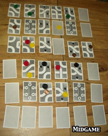 Setup: Game play begins with the construction of a 6x6 grid of cards. The four "point" cards are placed face up, each one row and one column in from the edges. The other 32 cards on the grid are all placed face-down; they'll be revealed during play. Important note: the board wraps around, top to bottom and left to right for the purpose of all tunnel continuations.