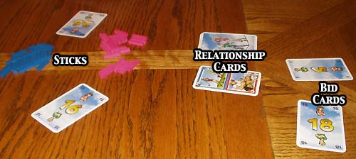 Ending a Round: The round ends when the 9 relationship cards have been turned up and won. At this point each player earns a score equal to the number of sticks he has.