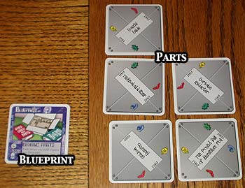 The Cards: The whole goal of Igor is to construct 10 or more Victory Points worth of machines. This is done by laying out blueprint cards, which name a device, list a special power, and list a number of parts required to complete the device; and then laying out parts cards by matching edges of each parts card to the edge of another parts card with the same connector. Once a sufficient number of parts are connected, the device is automatically created.