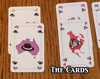 The Cards. As already mentioned, the playing cards each feature one continent and one item (e.g. a purple/Australia hat or a orange/Europe watch or a green/Asia sunglasses).
