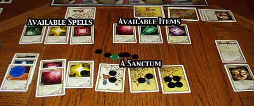 Your Sanctum. This is a fancy phrase for the cards on the table in front of you. Some are face-up and some are face-down. Besides the spells and items you're working on, you'll also have "active" items which you've completed and "prize-winning" cards which are still in play, but don't generate any further points.