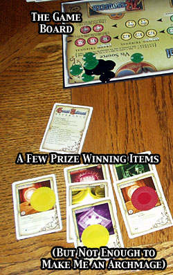 The Cards. There are three types of cards: resources, items, and spells. The resource cards give you various bonuses throughout the game. They're usually costly to draw ... except during setup (which I think is an imbalance). The item cards let you enchant items, and the spell cards let you create spells (to later place in those items). Each of the spells and items has a type (6 item categories, 4 spell categories), and each has a vis cost (a varying amount for items, 2 for spells).