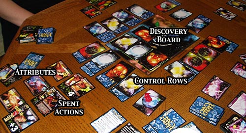 Gameboard: A small two-panel board printed with various 3-D space graphics. It's mainly a card holder, with 3 discovery queue spaces (used for upcoming discoveries) and 4 discovery space spaces (used for current discoveries).