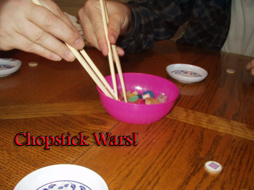 I was surprised that the chopsticks were a lot easier to use than I'd expected. I do use chopsticks when I have Japanese, Chinese, Thai, or Vietnamese food, so I'm not a raw beginner, but I've never been that great with them. However, grabbing wooden bits turns out to be a lot easier than squishy food items, and so my moderate level of expertise turned out to be more than enough for the game.