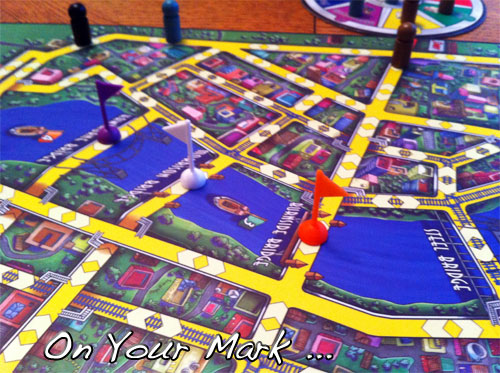 Theming: The theming of the game doesn't actually match entirely with its mechanics. According to the background story, you're supposed to cross every bridge, but in actuality you need to cross bridges using specific types of transportation to secure flags of eight types. I also had some qualms with how the speeds were laid out for different types of transport. Buses are said to be the same speed as cars, for example, while street cars are almost twice as fast. Any rider of public transit can tell you that neither of these is true. Overall, the idea of racing about town using a variety of transportation is carried off pretty well, but these nitpicks (and a few others) did force some of our players to suspend their disbelief. 3 out of 5.