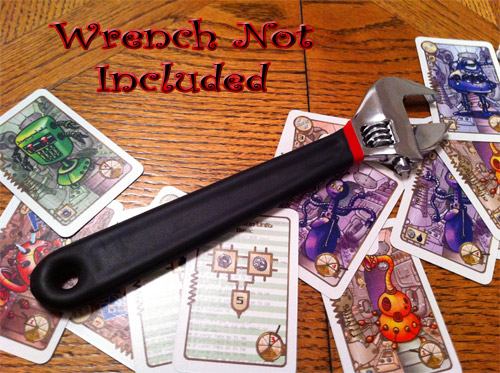 The Bid: Bidding occurs one card at a time and is very simple: each player makes a face-down bid and reveals it. The highest bidder pays and everyone else gets their bid back. A wrench (not included) circulates around the table to arbitrate ties.