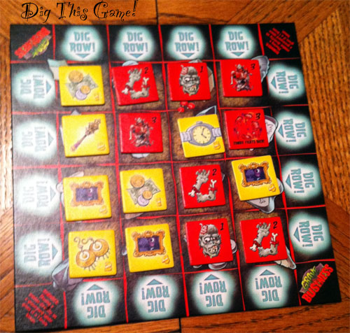 Digging is an exercise in majority control. You examine each space in the grave yard and see how much zombie strength (measured in brains and bones) has been focused on that space by each player. The winner takes the treasure or body part from the space.