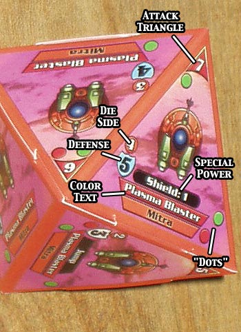 In addition the "1" side of each die provides the die's name and point-value, along with a helpful synopsis of the die's classification (e.g., "fighter", "frigate", "commander", etc). The synopsis is terrific when you're trying to figure out which die to throw next. But, the point value only appearing on the "1" side can be troublesome in-game when you're trying to decide which die to shoot, and have to do extensive head craning to figure out the value of everything on the table. (In a few cases we just had to shrug our shoulders and admit we didn't know a die's value because its "1" side was face-down on the table.)