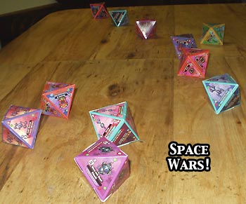 Dice: The dice which are the heart of the game come unassembled. Your first time out, there's thus a bit of inserting tab A into slot B, but it goes pretty fast, especially once you've done a few. There are 25 dice in each of the two core Diceland sets and another 8 dice in Diceland: Extra Space. (We sat down and assembled all 50 core Space dice the first time we played, and it took 30-45 minutes.)