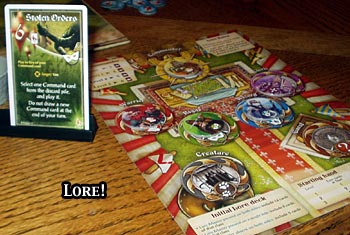 Each player now also has a collection of lore. He gets one to three lore tokens at the start of the game, and now gets one additional lore whenever he rolls a lore face on a combat die (if it isn't used for some other purpose). Further, at the end of each turn a player gets to draw 2 lore tokens and/or lore cards.